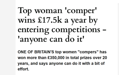Their success was down to a ‘comping’ strategy where they accessed so many competitions each week, their winning odds were MASSIVELY increased.
